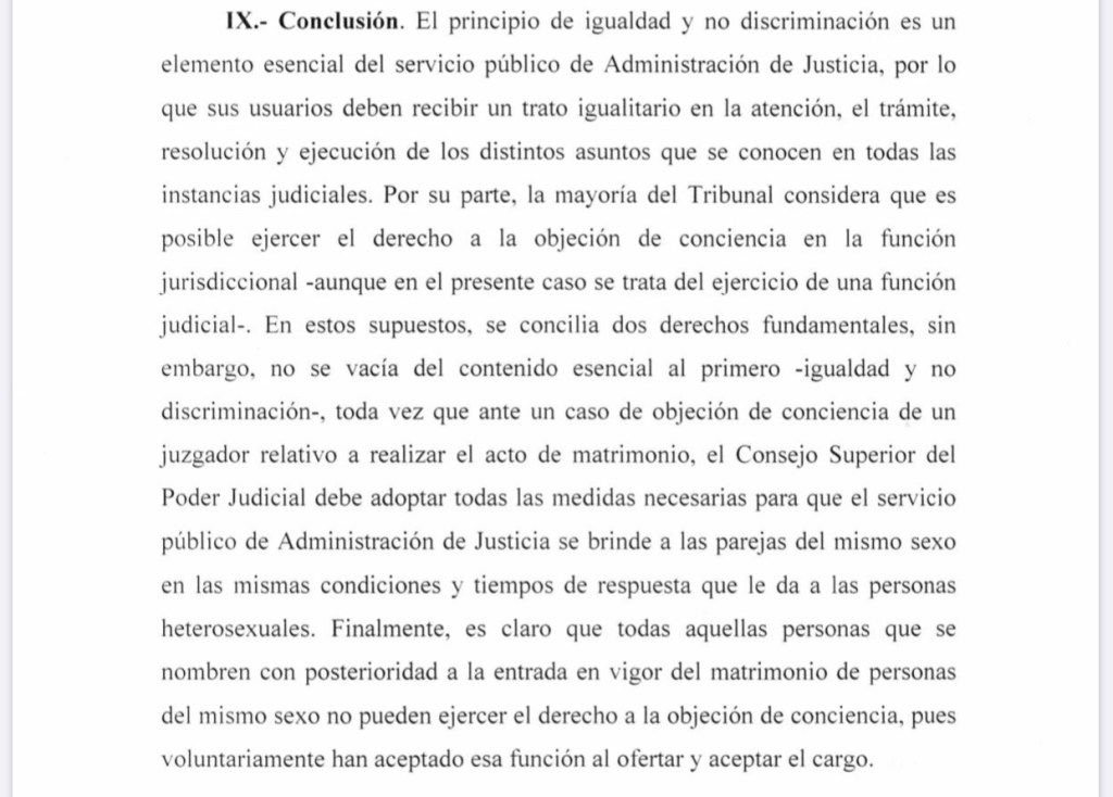 Según la sentencia constitucional 2020-001619, se declara que aunque hay colisión entre el principio y el derecho de igualdad y no discriminación y el derecho a la objeción de conciencia, este último impera obligando al Consejo Superior en caso de un juez o jueza que no quiera realizar un matrimonio entre personas del mismo sexo a tomar acción para que éste se pueda realizar.