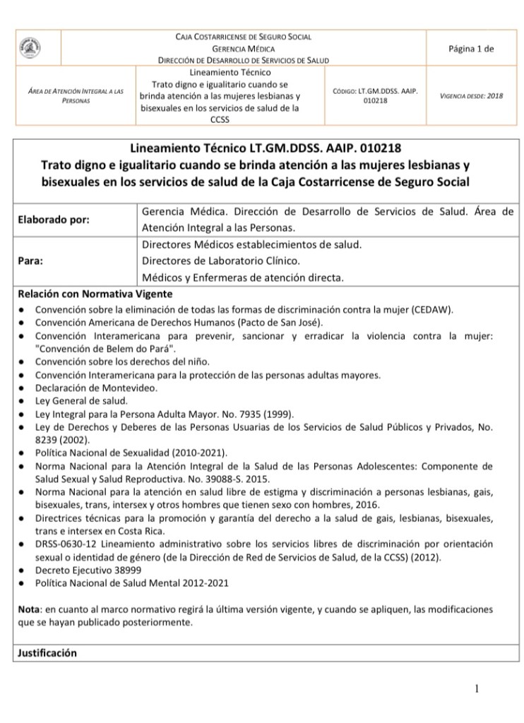 En el 2018, fue aprobado un lineamiento determinante para las mujeres bisexuales y lesbianas en Costa Rica. El nombre formal es “Lineamiento Técnico LT.GM.DDSS. AAIP. 010218 Trato digno e igualitario cuando se brinda atención a las mujeres lesbianas y bisexuales en los servicios de salud de la Caja Costarricense de Seguro Social”. Este fue aprobado gracias al trabajo de sociedad civil, esto por cuanto varias organizaciones nos unimos para hacer notar la necesidad de normativa que considerara nuestras especificidades en relación a la atención en salud desde el servicio público de salud, es decir desde la Caja Costarricense del Seguro Social.