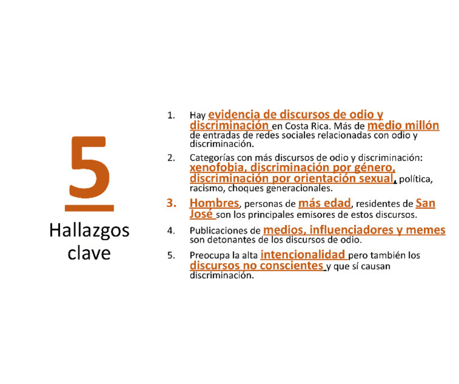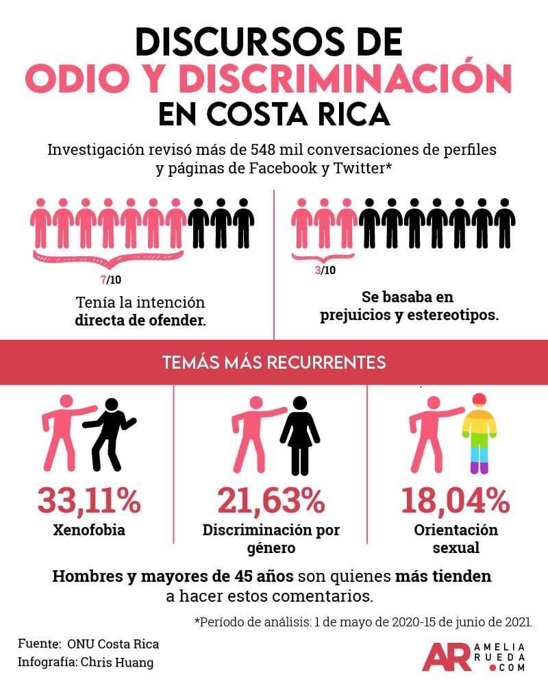 El día de hoy 6 de julio del 2021, Naciones Unidas presentó el Plan Costa Rica contra los discursos de odio y discriminación. Varias acciones de este plan, ya están en ejecución. Dentro de estas está una investigación que identificó más de medio millón de conversaciones ligadas a discursos de odio y discriminación en redes sociales desde Costa Rica. Los resultados arrojaron que son las personas extranjeras, mujeres y población LGBTIQ+, las poblaciones más afectadas por discursos de odio y discriminación en redes sociales en nuestro país. De ahí, la importancia de dicho Plan de acción. para educar, sensibilizar y combatir estos discursos de odio.
